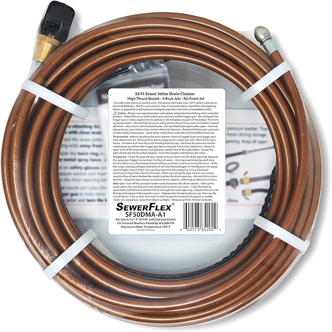 Sewer Jetter 50 Ft Premium Drain Cleaner For Your Electric Or Gas Pressure Washer Up To 2 8 Gpm Only For Trigger Guns That Have A Metal Spray Lance Garden Outdoor Amazon Com